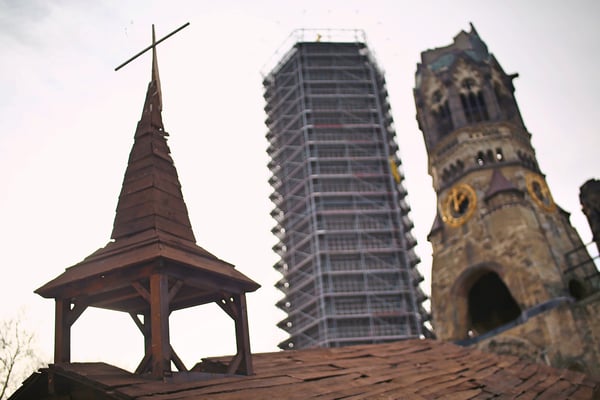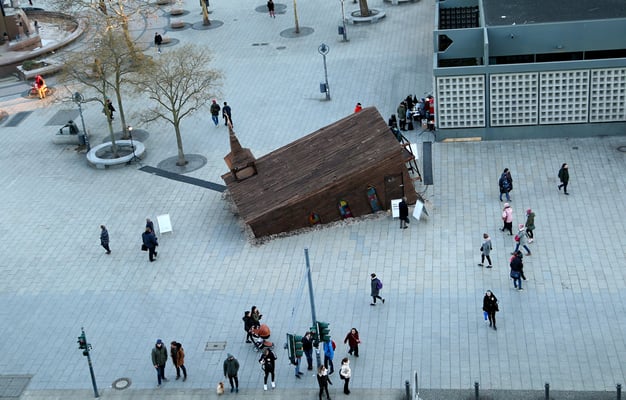 Wie sich herausstellte, herrschte im Inneren der Kirche eine gewisse Verzweiflung: zwar half der reformatorische Geist zuweilen immer noch der sogenannten Schwachheit auf, vielmehr jedoch verantwortete er Moralmonotonie und das Gefühl unüberbrückbarer Distanzen zwischen Mensch und Gott. Hier nun funkte Novoflot dazwischen und stellte die Ankunft einer neuen, der Menschheit glückhaft verbundenen Götterschaft in Aussicht. Viele hundert Besucher waren damals am Rosa-Luxemburg-Platz dabei. Und nachdem der Kirchenbau von Novoflot zwischenzeitlich in Bremen für Aufsehen sorgte, kehrt er nunmehr nach Berlin zurück. Und zwar an den Westberliner Breitscheidplatz.