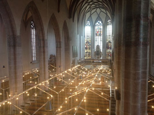 Konzertpodium und Publikum auf. Bespielt wird die ganze Kirche. Das in den Raum hineingewinkelte Zeltgestänge klammert Musiker und Hörer zusammen. Kalkuliert instabil und dürftig wirkt diese