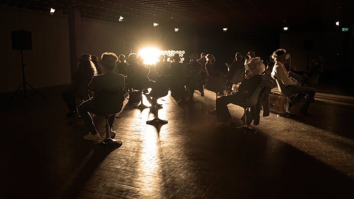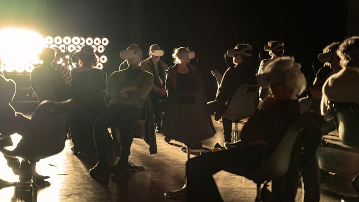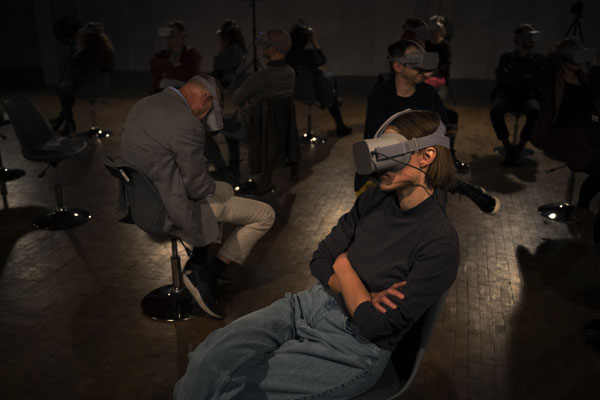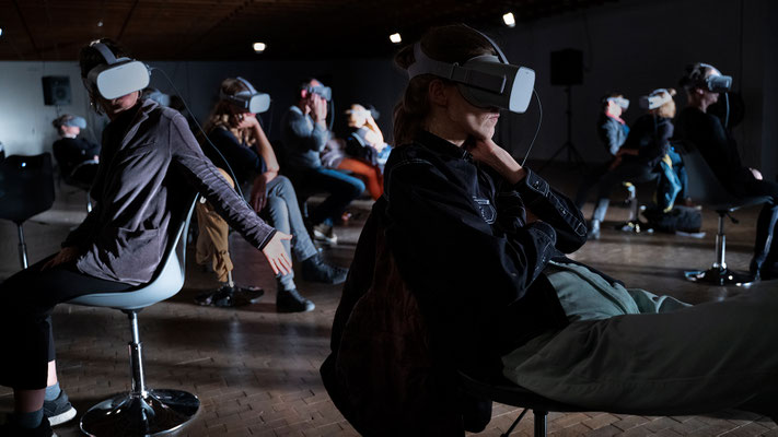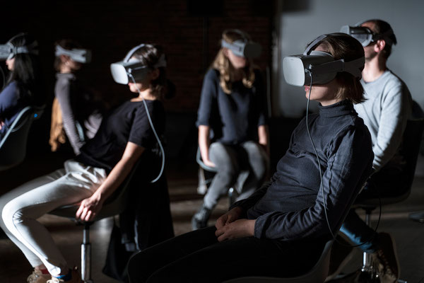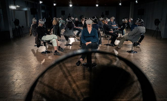In Fluss (Stadt Land), dem dritten Teil der Trilogie Stadt Land Fluss, ist das Publikum für eine Stunde an zwei Orten zugleich: Als Gruppe teilt es einen darstellerlosen, leeren Bühnenraum, in dem es auf sich selbst zurückgeworfen ist. Vereinzelt, und von der Gruppe isoliert durch eine VR-Brille, wird jede*r Besucher*in aber gleichzeitig an einen jener Orte versetzt, an dem die Frage nach Zugehörigkeit zu einer Schutz bietenden Gesellschaft auf dem Spiel steht: an die Außengrenze der EU, an das Ufer des Grenzflusses Evros zwischen Griechenland und der Türkei.
